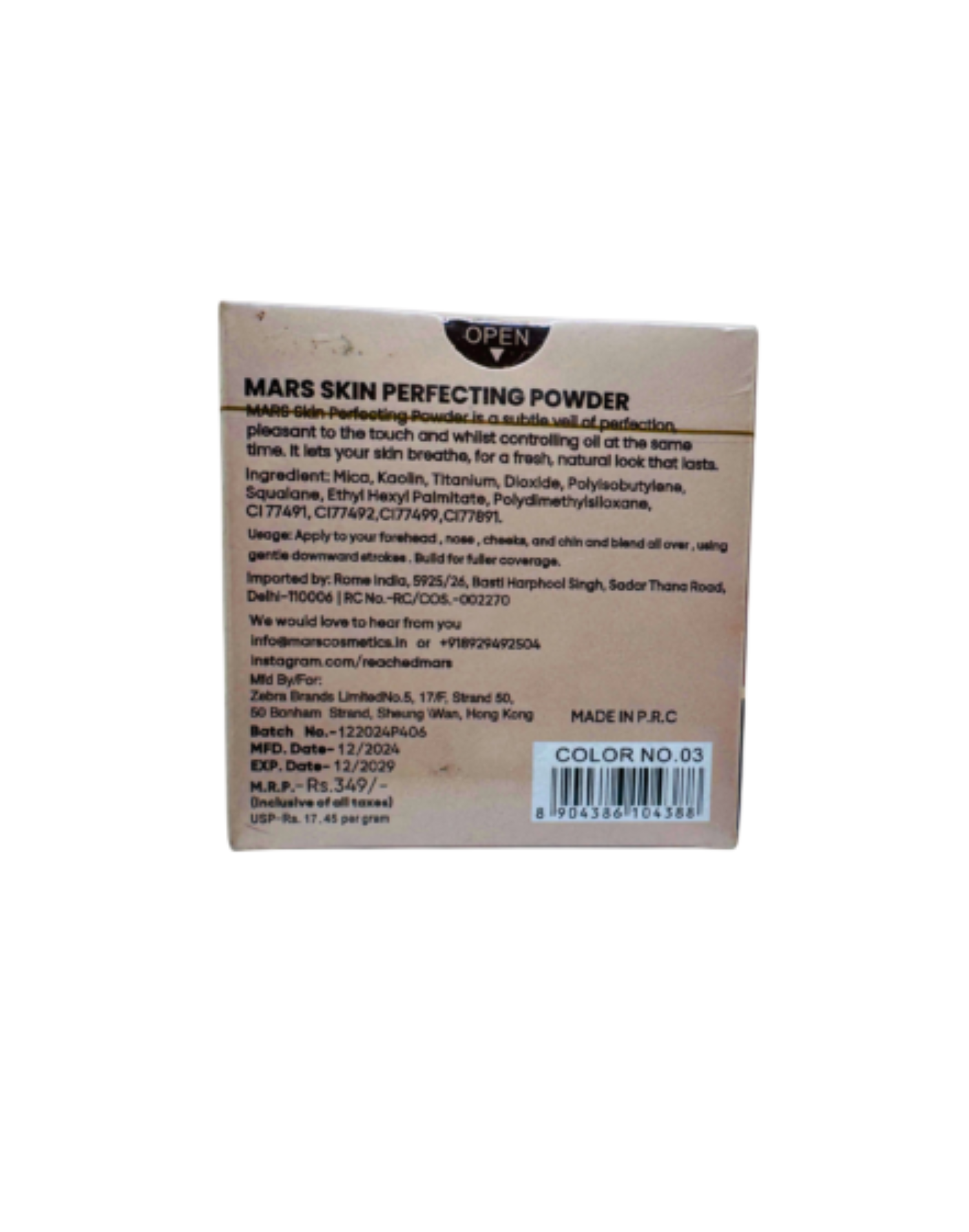 Achieve a naturally radiant look with MARS Skin Perfecting Powder, designed to give your skin a soft, airbrushed finish. Its finely milled formula blends seamlessly, minimizing imperfections and evening out skin tone without feeling heavy. The lightweight texture controls excess oil and shine, making it ideal for long wear. Perfect for touch-ups or as a finishing powder over foundation, it ensures a smooth, flawless complexion that lasts. Whether you’re aiming for everyday elegance or a polished evening look, MARS Skin Perfecting Powder is your go-to essential for skin that looks effortlessly perfect.